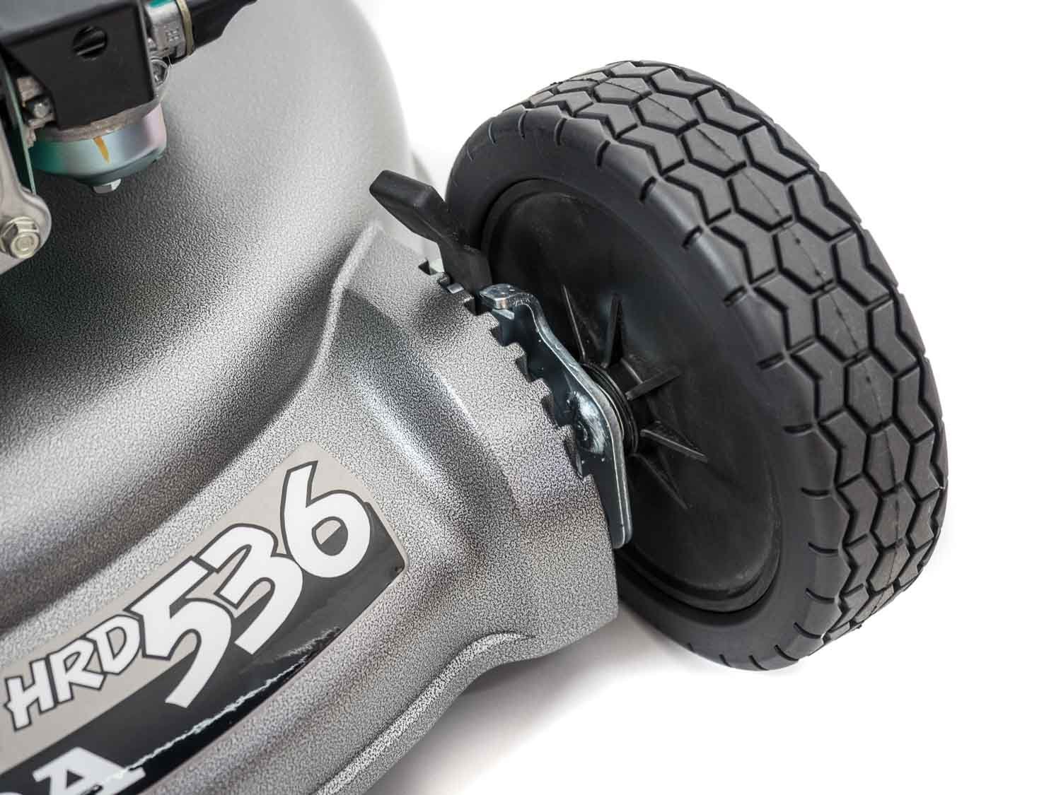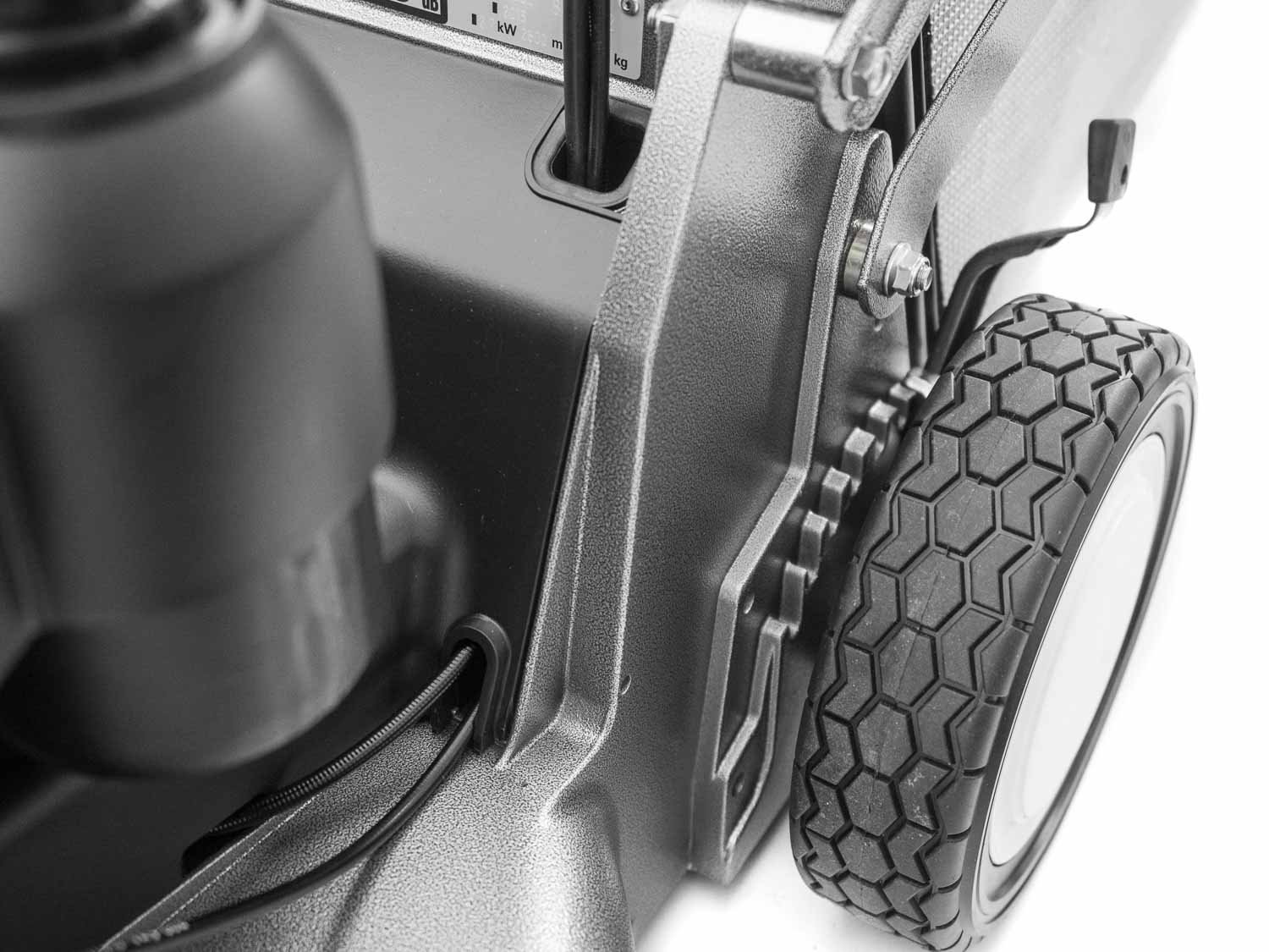 Hintere Walze: Mit der stabilisierenden Walze an der Hinterachse erhalten Sie die Streifen und Schachbrettmuster (Sportplätze, englischer Rasen). Außerdem bietet sie eine bessere Kontrolle beim Mähen um die Kante Ihres Rasens.