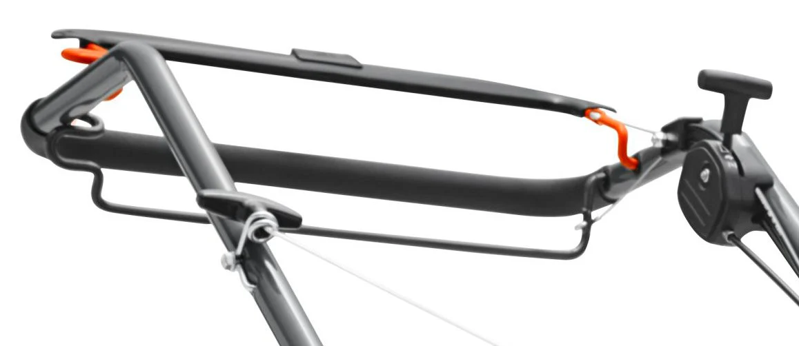 | Dank des klappbaren Führungsholm kann der Rasenmäher platzsparend eingelagert oder transportiert werden. | |