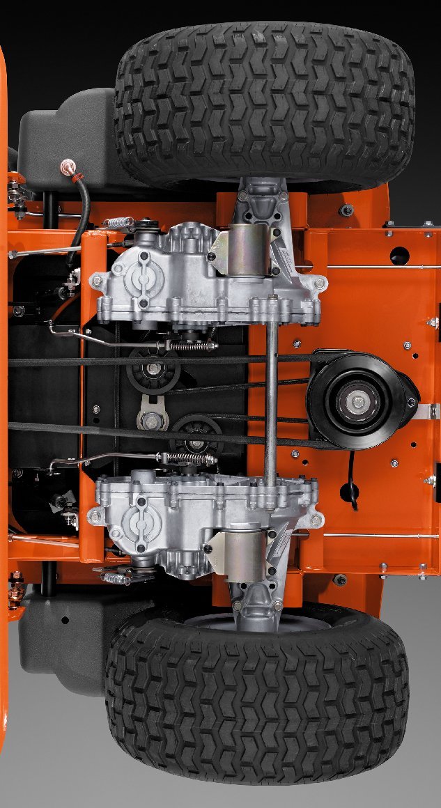| Hydrostat-Getriebe ermöglicht Geschwindigkeitsveränderung sowie Wechsel zwischen vorwärts und rückwärts fahren ohne schalten oder kuppeln zu müssen | |
