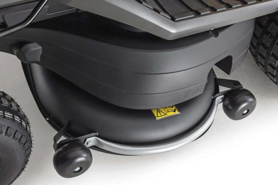 Ein stufenloser hydrostatischer Antrieb – der über ein Fußpedal eingestellt wird – optimiert die Manövrierfähigkeit und erleichtert das sichere Umfahren von Hindernissen, während ein Waschanschluss die problemlose Entfernung von korrosiven, leistungsmindernden Verunreinigungen von der Unterseite des 108 cm langen, mit zwei Messern verstärkten Schneidwerks ermöglicht.